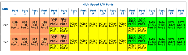 Собственно, именно поэтому мы говорим, что чипсет поддерживает до 8 портов PCIe, до 6 портов USB 3.0 и до 6 портов SATA 6 Гбит/с, но это не значит, что их можно реализовать одновременно. Всего высокоскоростных портов ввода/вывода не может быть более 18. Поэтому если на плате реализовано 6 портов USB 3.0 и 6 портов SATA 6 Гбит/с, то на ней может быть только 6 портов PCIe. Если же реализовано 6 портов SATA 6 Гбит/с и 8 портов PCIe, то может быть только 4 порта USB 3.0. Диаграмма распределения высокоскоростных портов ввода/вывода для чипсетов Z97 и H97 показана на рисунке.