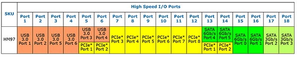 Для мобильного чипсета HM97 справедливо все то же самое, однако у него есть два портa SATA 3 Гбит/с, которые строго фиксированы. Соответственно, количество портов SATA 6 Гбит/с может меняться от 2 до 4.