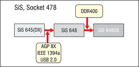 SiS 648 представляет собой дальнейшее развитие идей, заложенных в SiS 645DX, с частично (но не сильно) переделанным и оптимизированным северным мостом, значительно обновленным, «усовремененным» и улучшенным южным. Поддерживаются 533 MHz FSB и DDR266/333, кроме того, контроллер AGP соответствует третьей версии спецификации, т. е. совместим с режимом 8X. Южный мост SiS 963 получил поддержку USB 2.0 и (Внимание! уникальный чипсет для всей платформы!) одновременно — IEEE1394a (FireWire). О прочих «мелочах», в частности AC'97 2.2, UATA/133, на этом фоне даже как-то неудобно и вспоминать — естественно, они тоже присутствуют. Что ж, SiS, видимо, в очередной раз порадует нас весьма «продвинутым» современным чипсетом, надеемся, сохраняя традиционно невысокую цену конечных продуктов на его основе. Пока что плат на SiS 648 у нас еще не было, но, судя по всему, это случится в самое ближайшее время, так как серийно они уже выпускаются.