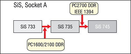 Перейдем теперь к SiS — неужели компания сдалась и не пытается придумать что-нибудь новое? Нет, и в качестве «нашего ответа Чемберлену» (VIA с ее КТ333) SiS предлагает чипсет за номером 745 такое же решение, как и 735, состоящее из одного чипа. Однако теперь поддерживается память РС2700, а еще интегрирован контроллер IEEE 1394 (FireWire). Жаль, что до сих пор SiS 745 на рынке представлен весьма слабо — в основном, на платах все той же Elitegroup.