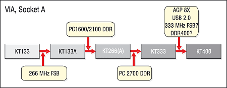 Естественно, VIA не сидела сложа руки — и, спустя всего два месяца после начала продаж КТ266, был негромко объявлен чипсет КТ266А, отличающийся от предыдущего лишь контроллером памяти. Его переработали и оптимизировали, что незамедлительно дало желаемый результат — на платформе Socket A появился новый лидер. Кроме того, слегка (косметически) подправили спецификации — теперь чипсет поддерживал до 4 GB памяти. Естественно, платы на KT266А не анонсировали только ленивые — чипсет получил повсеместное распространение, да и на сегодняшний день большинство ОЕМ-поставок, пожалуй, приходится именно на него. Кроме всего прочего, отметим еще одну особенность KT266(A), позволившую производителям значительно расширить спектр предложений на этом наборе микросхем. Речь идет о так называемой архитектуре V-MAP (VIA Modular Architecture Platform). Вот в чем ее суть: северный мост КТ266А полностью по контактам совместим с КТ266, а южные мосты VT8233, VT8233A и VT8233C совместимы друг с другом и с V-Link, что, в конечном счете, позволяет без особых затрат на разработку нового дизайна материнской платы улучшать характеристики продуктов. Именно поэтому производители материнских плат достаточно быстро и «безболезненно» перешли на КТ266А. Кроме того, благодаря совместимости южных мостов многие платы на КТ266А вскоре получили поддерживающий UATA/133 чип VT8233A или содержащий встроенную сетевую плату от 3Com VT8233C. А позднее, когда был объявлен VT8235 (поддержка USB 2.0, UATA/133, V-Link 266/533 MBps), некоторые платы снабжались и им.