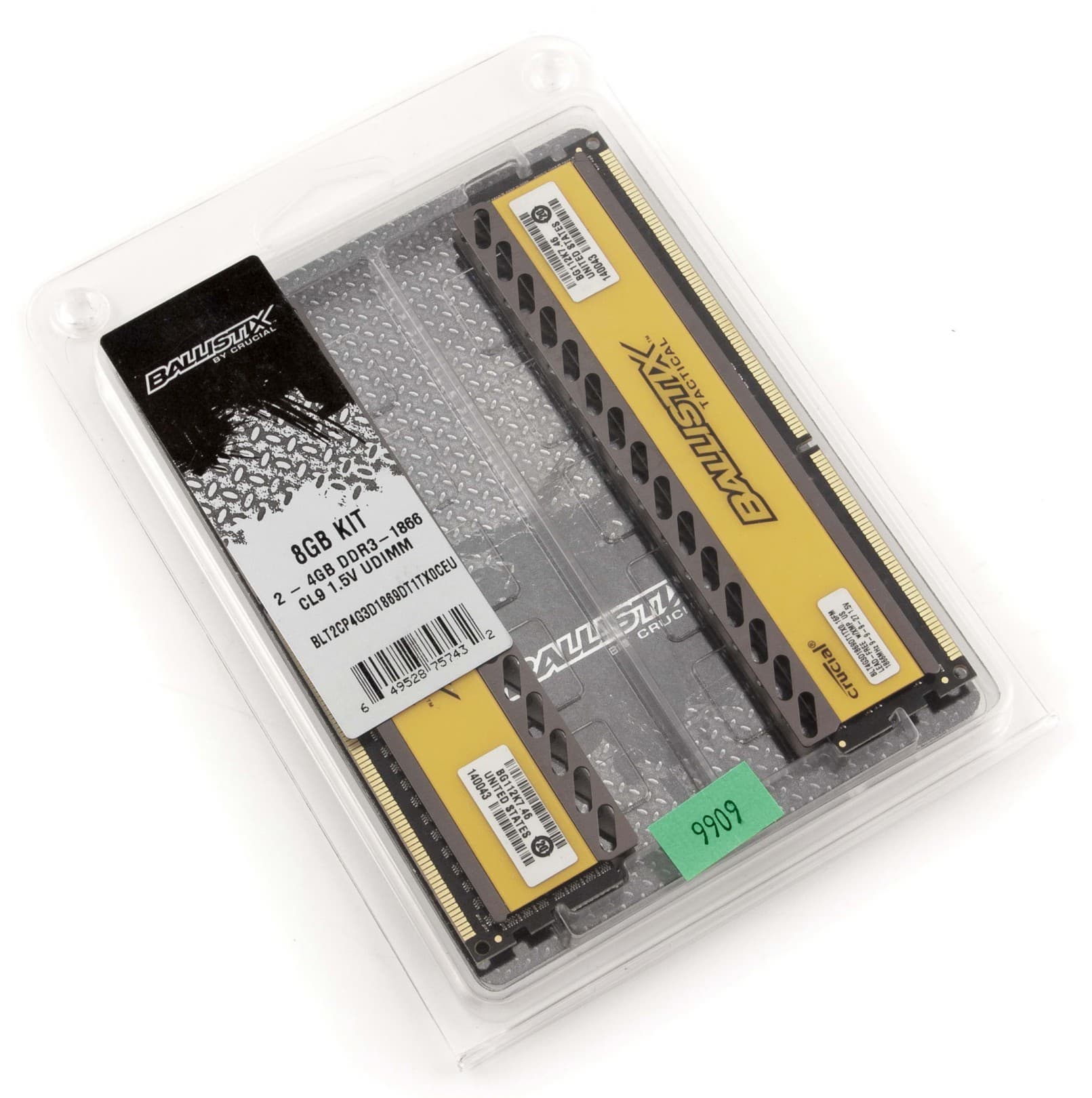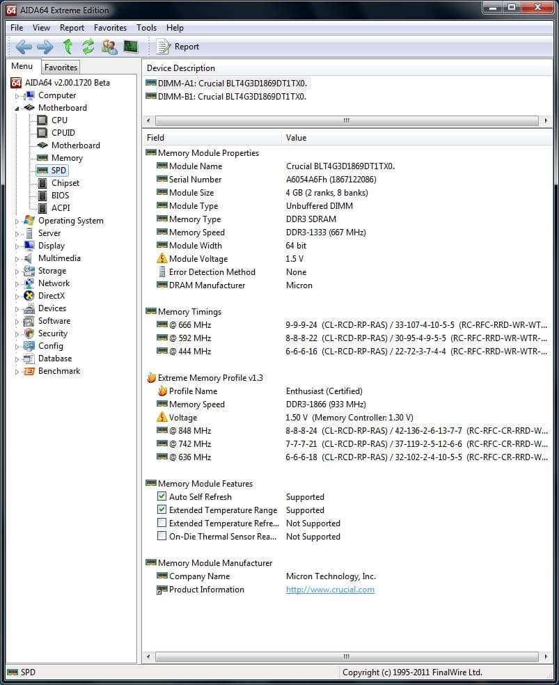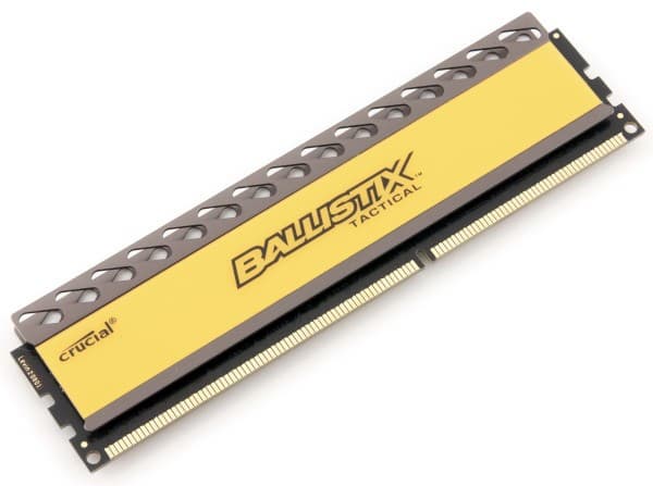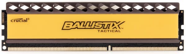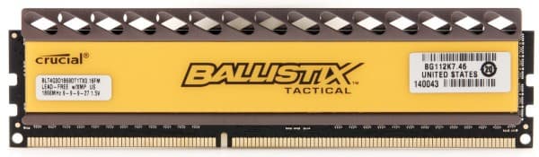 Двухканальный комплект памяти (2×2 ГБ) Crucial, рассчитанный на частоту 1866 МГц при достаточно жесткой схеме таймингов и низком рекомендованном напряжении. Компания Crucial интересна тем, что использует не самую распространенную элементную базу — в данном случае микросхемы компании Micron.