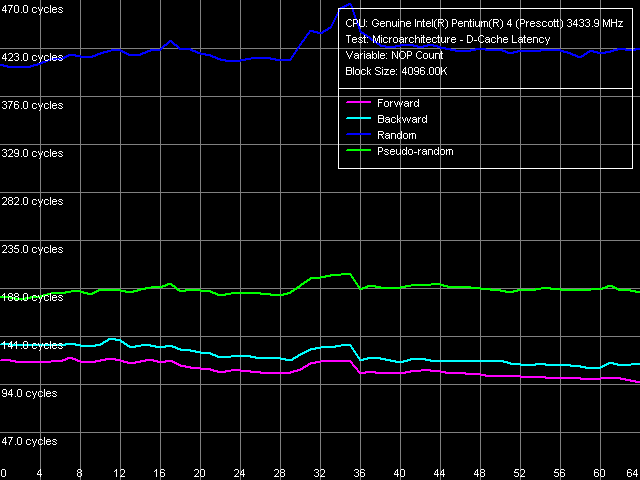 Методика измерений латентности, применительно к процессорам семейства Pentium 4, была подробно разработана, обоснована и описана ранее. Поэтому остановимся на ней лишь вкратце: в тесте латентности используется псевдослучайный режим обхода сравнительно большого блока памяти (4 МБ) с шагом в 64 байта (действительный размер строки L2- кэша процессоров Pentium 4) и 128 байт («эффективный» размер, связанный с аппаратной предвыборкой смежной строки из памяти в кэш во всех режимах обхода).