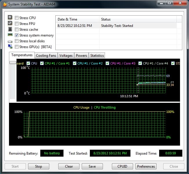 В качестве тестового стенда использовался компьютер на процессоре Intel Core i7-3820 (3,6/3,8 ГГц, кэш 10 МБ) с кулером Thermaltake Contac 30. Дополнительные компоненты: системная плата ASUS P9X79 Pro, видеокарта AMD Radeon HD7950, блок питания Enermax Revolution87+ 750 Вт.