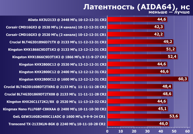 Латентность на равной частоте определяется таймингами, но когда частоты сильно разнятся, становится очевидно, что, например, комплекту GeiL даже ужатые тайминги не позволили выступить на равных с конкурентами.