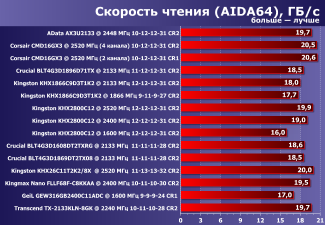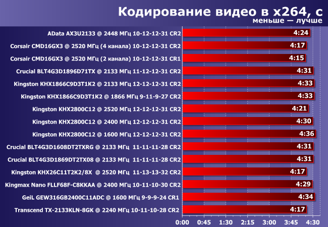 Любопытно равенство в производительности у модулей Kingston KHX26C11T2K2 и Transcend TX-2133KLN-8GK несмотря на значительную разницу в их частотах. Напомним, что опорные частоты в обоих случаях одинаковые (105 МГц). Однако, как видим, разница в таймингах в данном тесте скомпенсировала разницу в частотах.