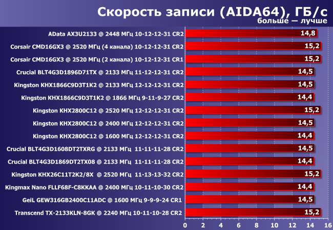 В тестах записи расклад сохраняется аналогичный, но разброс значений меньше. И это неудивительно, поскольку здесь производительность еще сильнее упирается в возможности платформы. Иными словами, повышение пропускной способности подсистемы памяти в этом режиме процессор в полной мере утилизировать не способен.