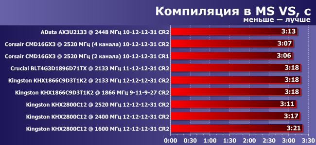 В тесте компиляции разница также наличествует. Причем видно, что, в отличие от предыдущего теста, этот больше зависит не от пропускной способности памяти, а от латентности.