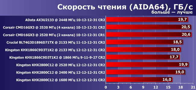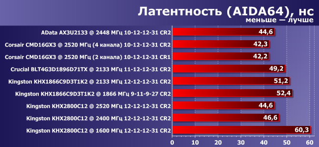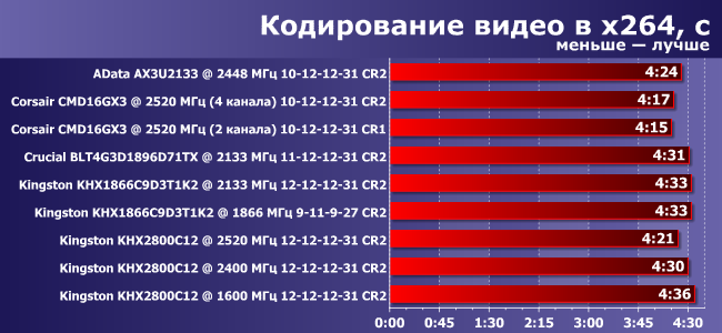 Обращает на себя внимание отставание модулей Kingston, для которых пришлось выставить повышенные тайминги. Причем тут же добавим, что и на частоте 2400 МГц понизить тайминги для этого комплекта не удалось (впрочем, как и для «платинового» Corsair). Частота 1600 МГц с таймингами 12-12-12-31 приведена в качестве «референсной» для сравнения чистого прироста от использования высокочастотной памяти по сравнению с памятью, официально заявленной в спецификации процессора. Безусловно, на этой частоте данный комплект памяти позволяет использовать и гораздо более жесткие тайминги, но вряд ли кто будет покупать этот комплект, чтобы использовать его в таком режиме.