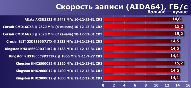 На скорость записи разница в таймингах влияет уже не так значительно. Легко заметить, что здесь основное узкое место — производительность контроллера памяти в процессоре. Соответственно, большое преимущество получают конфигурации, в которых мы повышали опорную частоту и, соответственно, частоту процессора.