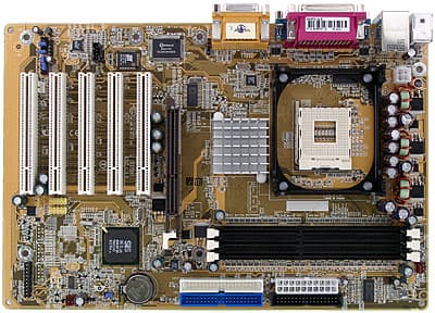 Разводка платы не идеальна, но это вполне естественно, учитывая ее размеры. В качестве недостатков стоит отметить расположение аудиоразъемов перед слотами PCI и скученность разъемов у модулей памяти, что будет препятствовать свободе манипуляций с последними. Доступ к единственной имеющейся перемычке не затруднен даже при установке платы в корпус, краткое описание ее функциональности приведено на текстолите платы. Наличие напряжения на разъемах для модулей памяти индицируется красным светодиодом. В трехканальном импульсном стабилизаторе напряжения питания процессора применены 11 конденсаторов по 1500 мкФ. Также на плате находятся стабилизаторы напряжения шины AGP (включающий 1 конденсатор на 1000 мкФ и несколько менее емких) и памяти (2 по 1000 мкФ).