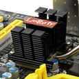 Система охлаждения, на наш взгляд, имеет оптимальную конструкцию для платы, ориентированной на поклонников разгона. Радиаторы на северном мосту и полевых транзисторах в цепи стабилизатора напряжения соединены тепловой трубкой. Соответственно, вся это конструкция сможет обдуваться воздушным кулером на процессоре любой конструкции. Очень понравилось, что закреплены сами радиаторы не дешевыми пластмассовыми грибками, а на шурупах.