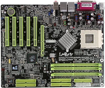 Разводка платы не очень удобна — разъемы IDE RAID расположены позади слотов PCI, а звуковые разъемы — перед ними, также может доставить затруднения скученность разъемов у модулей памяти. Доступ к перемычке может быть затруднен при установке платы в корпус, краткое ее описание приведено на текстолите. В трехканальном импульсном стабилизаторе напряжения питания процессора применены 6 конденсаторов по 3300 и 4 по 1500 мкФ. На плате находятся стабилизаторы напряжения шины AGP (1x1000 мкФ и несколько менее емких) и памяти (5x1000 мкФ).