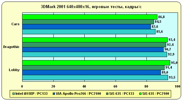 Для исследования производительности в офисных приложениях и при работе с графикой использовался стандартный для нашей Тестовой лаборатории пакет SYSmark 2000. Игровые приложения были представлены Quake III Arena 1.17 (OpenGL) и новым тестом 3DMark 2001 (Direct3D). В принципе, применять для оценки производительности видеокарт "синтетические" тесты, каковым и является 3DMark, считается не очень хорошим тоном, но следует учесть, что в данном случае мы оценивали производительность не видеоподсистемы, а чипсета, поэтому подошло бы практически любое приложение, работающее с нужным 3D API и обеспечивающее достаточную нагрузку. Тесты в 3DMark были проведены в двух разрешениях — 640 * 480 при 16-битовом цвете и 1280 * 1024 при 32-битовом, однако в статье мы приводим только первую диаграмму. Вторая по общей картине в принципе повторяет первую, только в более "сглаженном" виде (большую роль стал играть 3D-акселератор, что сократило разницу в производительности между разными чипсетами).