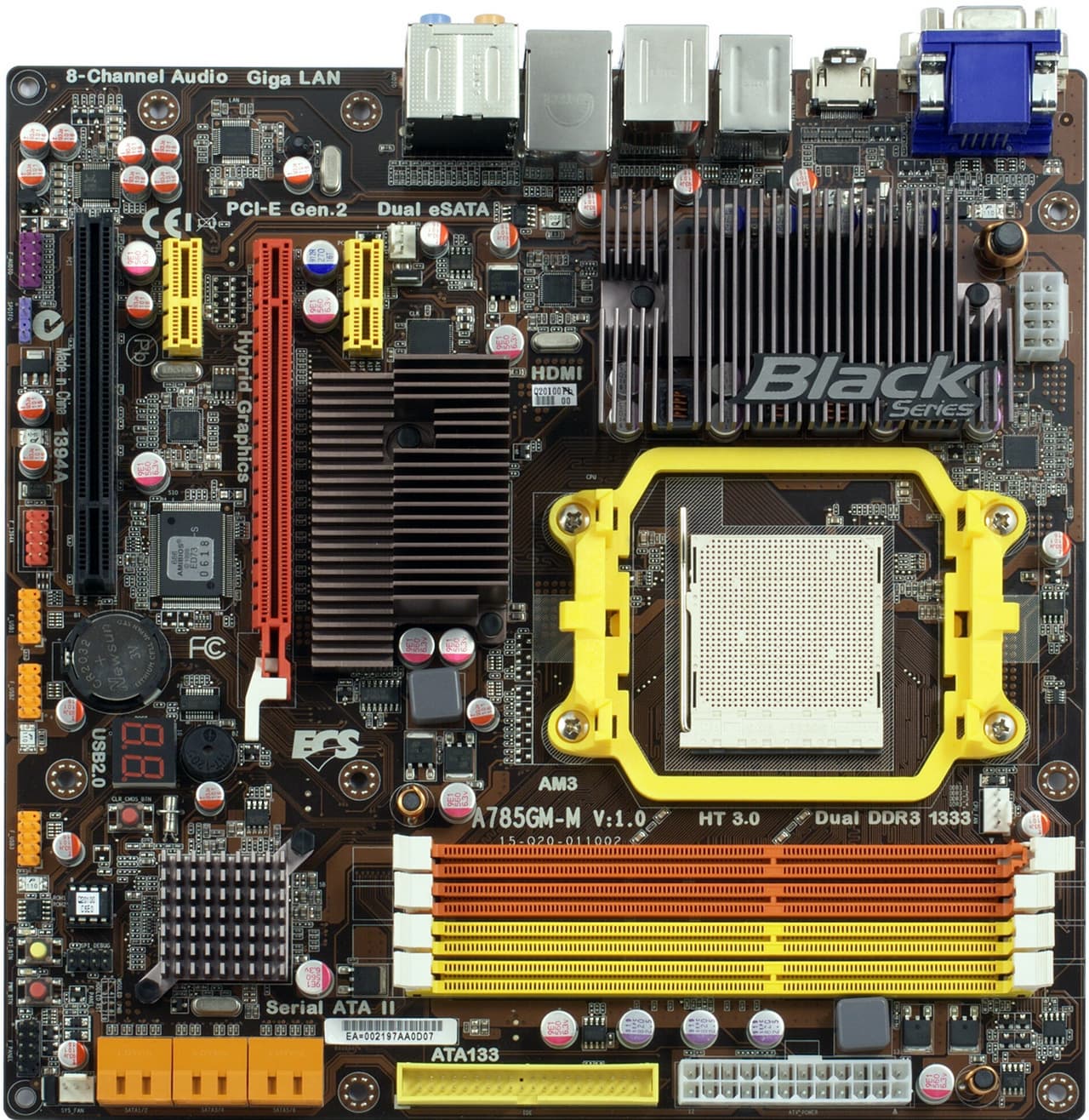 Серия «Black», в которую компания ECS включает среднебюджетные модели с теми или иными опциями, рассчитанными на требовательных пользователей, в свое время началась с модели ECS A780GM-A на чипсете AMD 780G. Надо отметить, что сама плата тогда была оснащена достаточно скромно, зато уж в деле ее продвижения компания ECS проявила образцовую активность. Достаточно сказать, что сама плата была доступна в розницу за несколько дней до анонса (причем даже в России, что из-за типичной локальной задержки означало не менее чем за месяц до начала поставок плат от конкурентов на этом чипсете). Привлекательная цена и даже некая рекламная активность также имели место.