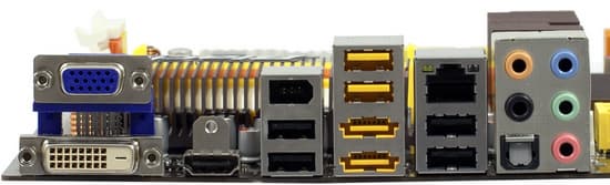 Компоновка платы — просто отличная, не к чему придраться даже по мелочам. Из необязательных, но приятных опций, которые, судя по всему, и должны поддержать статус платы «для привередливых, но экономных пользователей», отметим боковые колодки у SATA-разъемов, индикатор POST-кодов, кнопки для включения и перезапуска платы и сброса CMOS. Очень порадовало наличие на задней панели двух портов eSATA, реализованных даже не выносом чипсетных портов, а за счет дополнительного контроллера. Не пожадничали разработчики и в отношении FireWire. Итого, получился вполне достаточный, на наш взгляд, набор «завлекалочек», тем более когда речь идет о практичной microATX плате. Единственным спорным решением выглядит отсутствие PS/2-портов, большинству они, конечно, уже не нужны, но тем, кто не хочет отказываться от старой клавиатуры или KVM-переключателя, это надо иметь в виду.