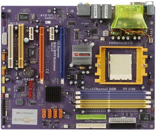 Плата выполнена с характерными чертами серии Extreme, включая «боевую раскраску» и вентилятор с небольшим воздуховодом на задней панели. А вот фирменного кулера вычурной формы на северном мосту чипсета в этот раз покупателям удалось избежать, так как ATI RD480 греется не очень сильно, поэтому оказалось вполне достаточно обычного небольшого радиатора. И пассивное охлаждение чипсета справляется со своей задачей, хотя, как и в случае с платой MSI RD480 Neo2, желательно дополнительное охлаждение радиатора на северном мосту потоком воздуха от процессорного кулера, что предусмотрено конструктивно за счет сокращения расстояния между данными компонентами. Оборотной стороной этой близости (а также близкого расположения разъемов для модулей памяти) является потенциальная невозможность установить кулеры с очень широким радиатором на процессор.