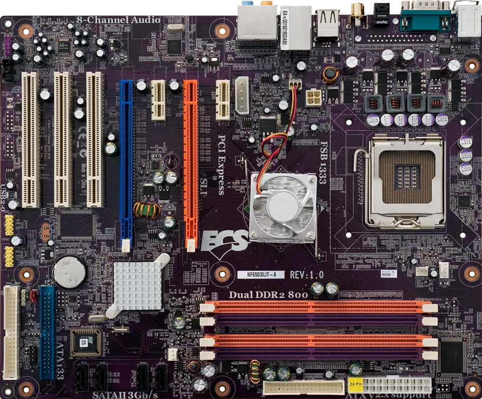 Сегодня мы рассмотрим системную плату, которая вроде бы относится к продуктам нижней ценовой категории по всем параметрам, но обладает поддержкой SLI. И конечно, к плюсам данной модели (хотя заслуга в этом только выбранного чипсета) относится «родная» поддержка IDE-устройств, чем, к сожалению, не могут похвалиться всё увеличивающие свое присутствие на рынке платы на Intel 965. Плата собрана на стеклотекстолите фиолетового цвета, на ней есть места под разъемы, которые производитель решил не устанавливать (LPT-порт, контроллер FireWire с разъемами и пр.). Последнее, возможно, свидетельствует о намерении компании позже выпустить в этой линейке плат модели с расширенной функциональностью, но на текущий момент на nForce 650i SLI у ECS только одна модель.