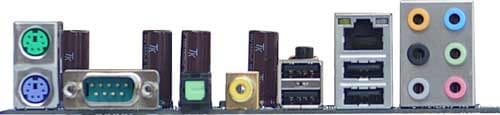 Охлаждение северного моста активное, южного моста пассивное, причем радиаторы на обоих очень малы. В штатном режиме система работала стабильно, особых проблем с температурой не зафиксировано. Импульсный стабилизатор напряжения питания процессора — четырехканальный, по 3 полевых транзистора на канал, с низкопрофильными полимерными конденсаторами серии SEPS (наиболее дорогие и качественные от Sanyo) в количестве 9 штук (по 820 мкФ, на 2,5 В), а также 4 стандартного размера по 1800 мкФ (на 16 В) от гораздо менее именитой JPCon. Кроме того, уделено должное внимание стабилизатору напряжения для памяти, который включает 6 качественных конденсаторов по 6300 мкФ на 6,3 В производства Sanyo, 2 по 1800 мкФ на 16 В (JPCon) и использует индуктивные элементы. Очень приятно отметить, что даже в платы среднего ценового диапазона ECS стала устанавливать одни из самых дорогих и качественных конденсаторов, так что ситуация с основными цепями питания на плате меняется в лучшую сторону. Наконец-то компания начала заботиться о качестве и надежности. Размер платы — 305×245 мм (полноразмерный ATX), крепление осуществляется при помощи 9 винтов, все углы жестко зафиксированы.
