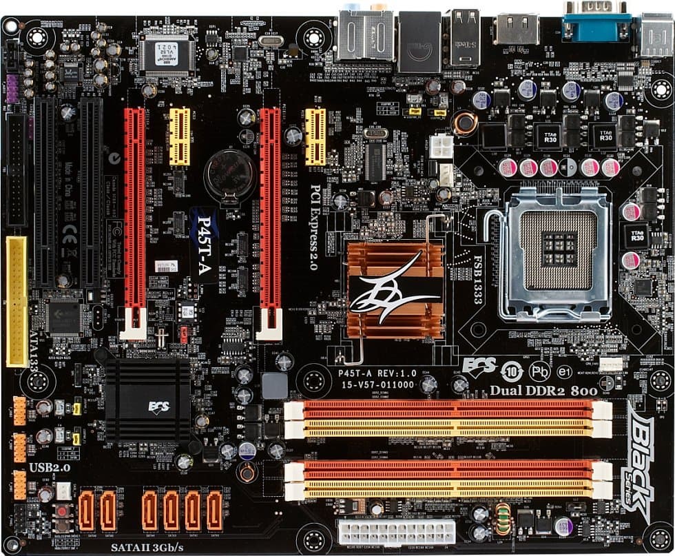 Впрочем, это, конечно же, совсем не тот фактор, который станет решающим при выборе платы, а вот по «серьезным» характеристикам модели Black Series довольно привлекательны. Это не типичные бюджетные и сверхбюджетные платы ECS (с которыми наверняка и сталкивается в большинстве случаев потребитель продукции этой компании), но и не пафосные и вряд ли оправдывающие свое высокое позиционирование модели из серии Extreme. Средний функциональный уровень, недорогой чипсет из средней линейки с поддержкой всех массовых современных технологий, хорошие возможности для расширения функциональности, качественные компоненты в критических цепях — вот ключевые характеристики этой серии плат. Давайте взглянем на продукт, соответствующий таким требованиям и основанный на новом чипсете Intel P45.