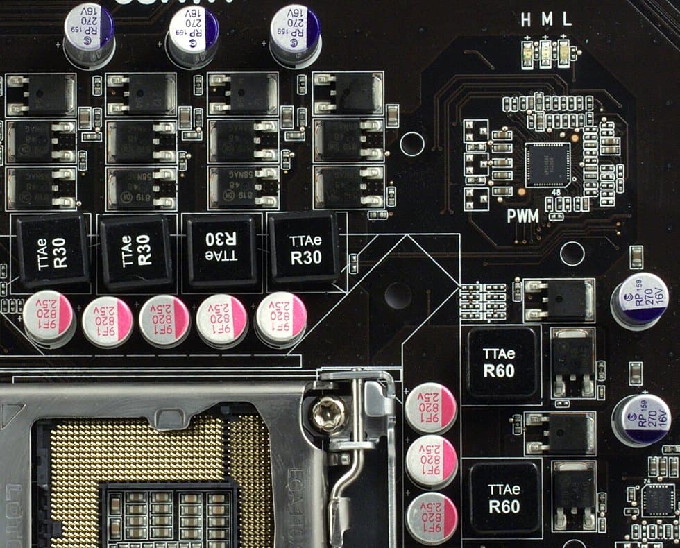 Для управления питанием процессора применены недорогие ШИМ-контроллеры uPI Semiconductor, один из которых, тем не менее, позволяет реализовать популярную сейчас функцию наглядной индикации работы. С этой целью в районе процессорного сокета установлены три светодиода (H-M-L), и ШИМ-контроллер, переключаясь в режим экономии энергии, при котором активными остаются лишь один-два канала в схеме питания, отключает сообразно этому лишние светодиоды. Никакой пользы от такой индикации нет, но в целом все, как у людей. Правда, компания не побеспокоилась создать фирменную утилиту, которая бы демонстрировала то же самое на экране вашего монитора, попутно подсчитывая экономию энергии в простое, сразу пересчитанную на выбросы CO2. Здесь у «зеленых технологий» еще есть простор для развития.