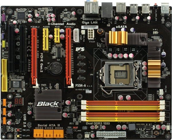 Компания решила установить на ECS P55H-A два слота PCI (один из которых, к тому же, может быть перекрыт радиатором второй видеокарты), стандартные для моделей на P55 два слота PCIEx16 (работающие одновременно в режиме x8+x8 при использовании двух видеоускорителей), а малое количество примененных периферийных контроллеров позволило выделить достаточно чипсетных линий PCI Express, чтобы организовать еще и слот PCIEx4. На поддержку SLI для платы решили не разоряться, так что пару видеокарт имеет смысл покупать только производства ATI. Про наличие разъема IDE (вопреки функциональности чипсета) мы уже упомянули, также из необязательных элементов отметим наличие разъема для подключения COM-порта на планке, но отсутствие поддержки флоппиков.