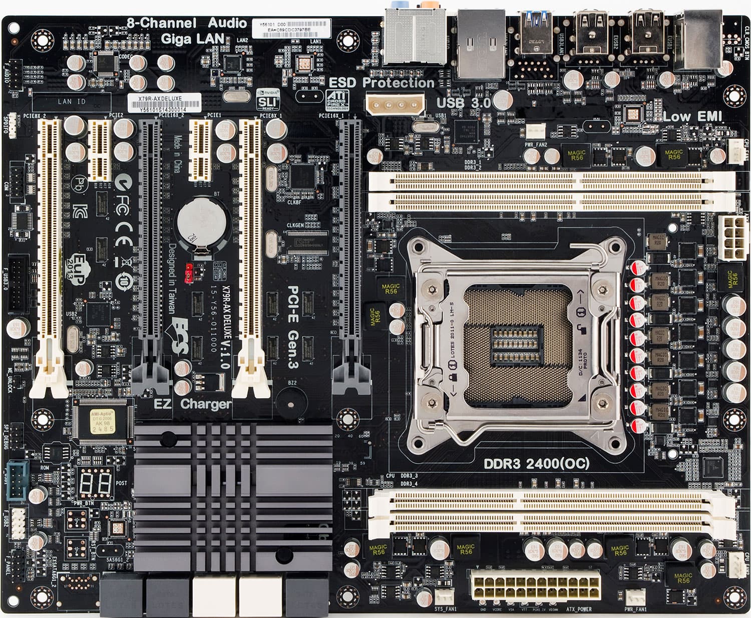 В качестве слотов расширения ECS готова предложить покупателям только PCI Express — зато много. Плата позволит вам штатно установить 4 видеокарты, причем работать они будут во вполне пристойном режиме: две пары слотов делят два полноскоростных интерфейса x16, то есть для двух карт это x16+x16, а для четырех — x8+x8+x8+x8. Совсем немало, учитывая, что контроллер PCI Express, интегрированный в новые процессоры (а все слоты PCIEx16, разумеется, подключены к процессору), поддерживает скорость работы PCI-E 3.0. Еще два слота PCIEx1 (2.0) подключены к чипсету и позволяют решить какие-то локальные задачи по дооснащению платы, не снижая пропускную способность двух «главных» слотов PCIEx16 для графики. ECS X79R-AX Deluxe официально поддерживает объединение до 4 видеокарт NVIDIA в SLI, а также, разумеется, ATI CrossFireX на 4 картах (но это бесплатно и у всех).