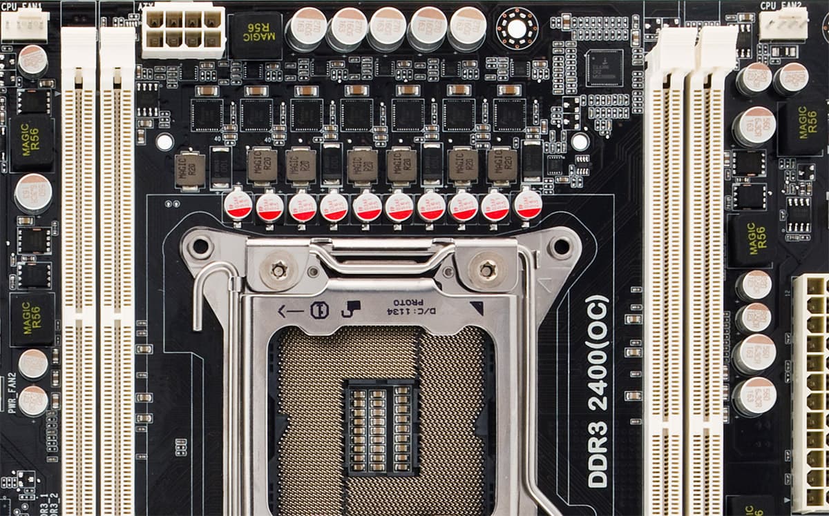 Преобразователь питания процессора теперь ужат на участке между слотами для памяти, а по бокам от последних — собственные преобразователи питания для модулей памяти.