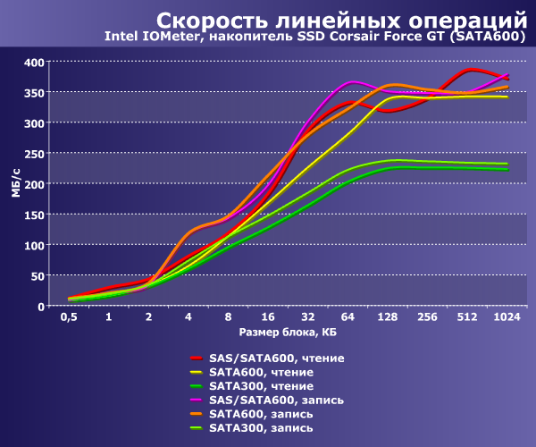 Нам показалось также интересным оценить максимальную достижимую скорость работы через такой порт SAS/SATA600, для чего мы, разумеется, воспользовались SSD-диском. Поскольку результаты IOMeter могут существенно зависеть от платформы и ОС, мы приводим их в наиболее читаемом виде — в сравнении со скоростью работы того же накопителя на «соседних» чипсетных портах SATA300 и SATA600.