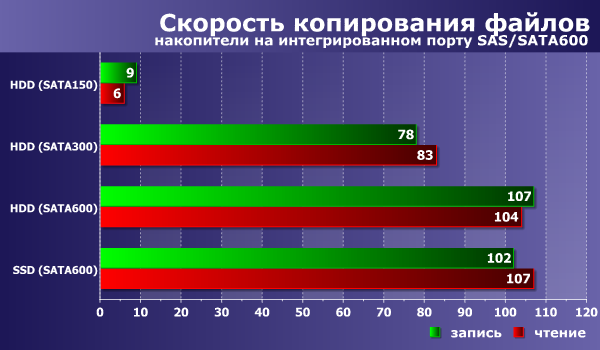 Ладно, оставим в покое лирику. Уникальный в своем роде контроллер побуждает нас проверить его в деле — интересны при этом и производительность, и совместимость со стабильностью. Начали мы с элементарного теста: копировали большой файл (≈6 ГБ) с и на накопитель, подключенный к порту SAS/SATA. Подключаемые накопители чередовались, а общим приемником/источником во всех случаях был системный винчестер Seagate Barracuda 7200.11, подключенный к «нормальному» чипсетному порту SATA600.