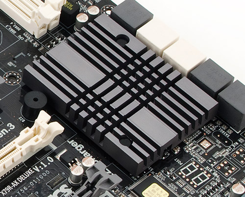 Охлаждением схемы питания процессора, имеющей столь солидное число каналов, компания ECS совершенно оправданно не озабочена — электронные компоненты предоставлены сами себе и конвекции воздуха (и при работе остаются теплыми). На чипсете же мы видим в случае X79R-AX Deluxe забавный радиатор, аналогичный использованному на многих других платах текущей волны. Забавность его обусловлена тем, что TDP у X79 не выше, чем у чипсетов платформы, например, Socket 1155 (во всяком случае, если интегрированный в чипсет SAS-контроллер не работает, то функциональность X79 и P67 полностью совпадает). В то же время, платы на P67 относились всего лишь к среднему сегменту, а выше Socket 2011 «на столе» сейчас ничего нет. Что же делать? Как выделить новые продукты?