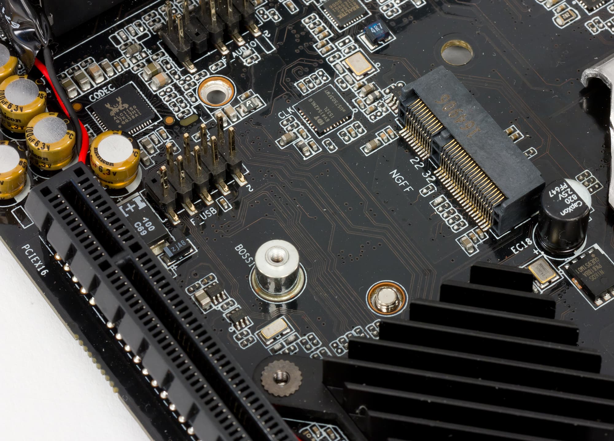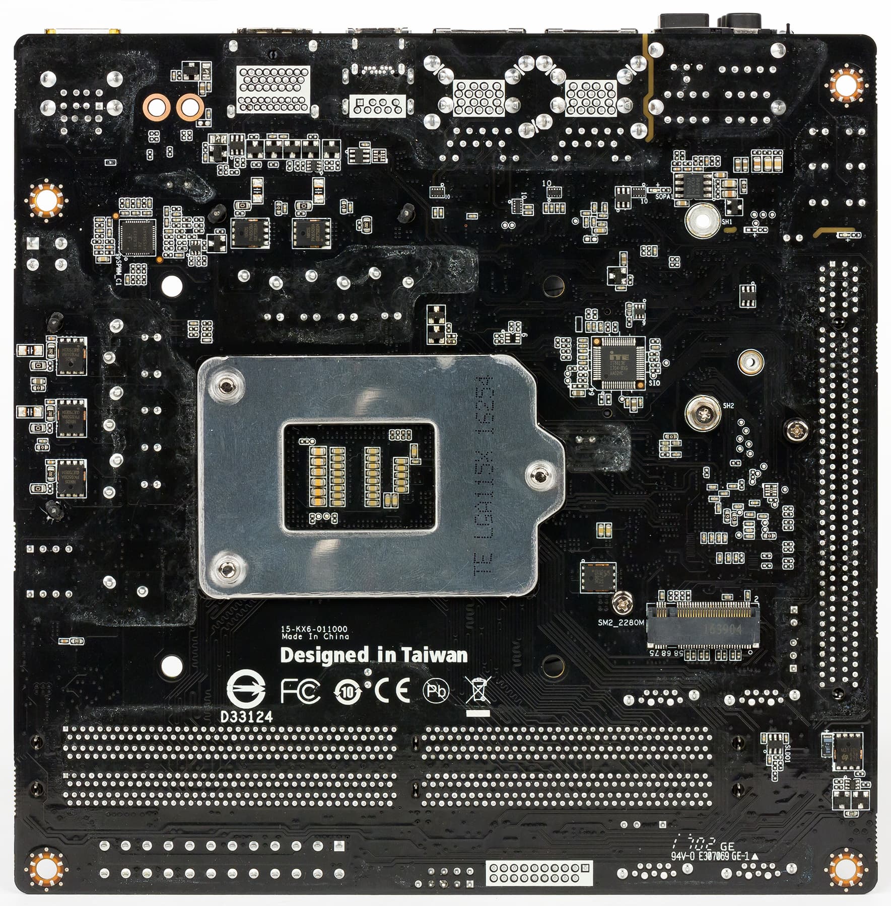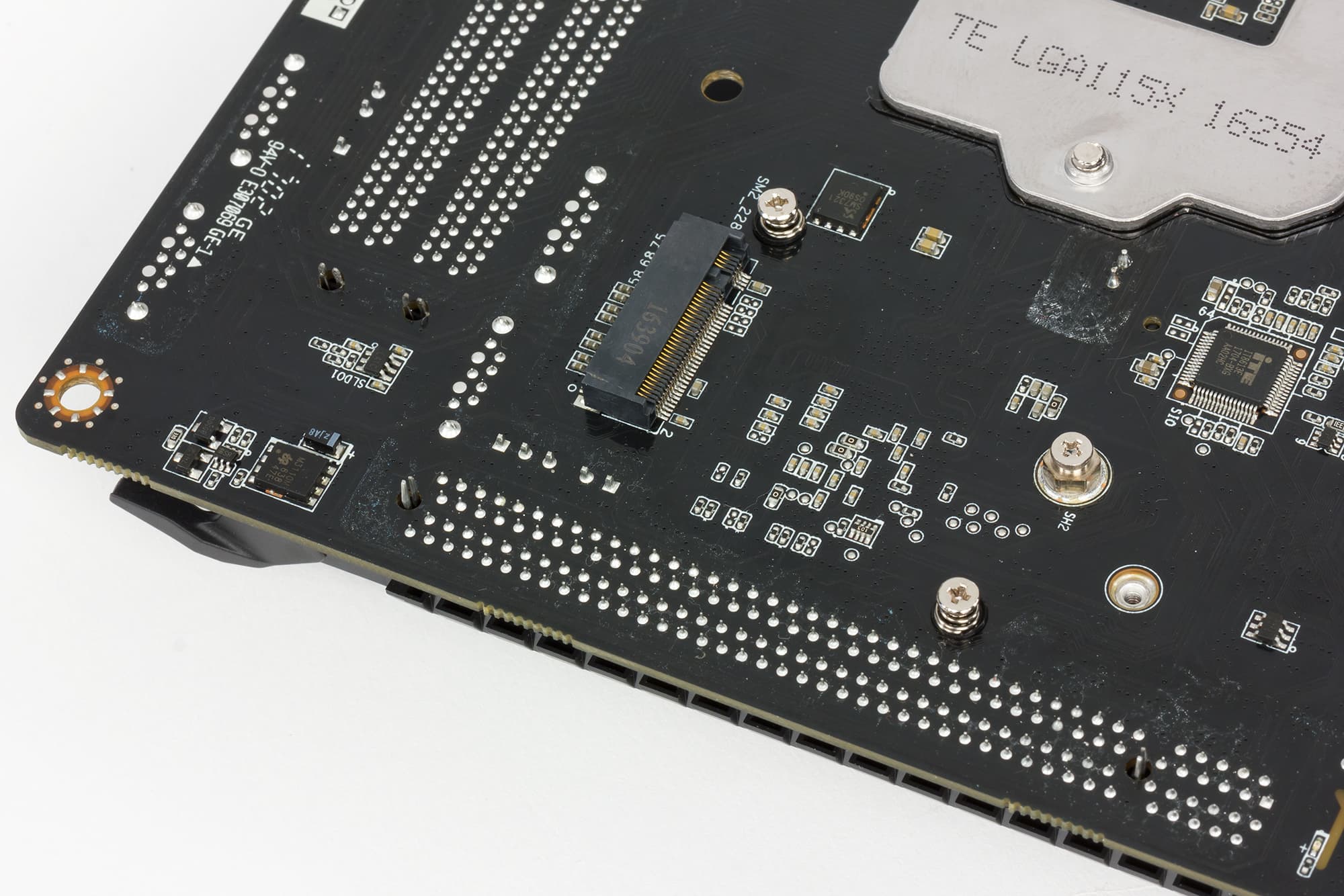 Один из разъемов M.2 (ключ M-типа) позволяет устанавливать накопители типоразмера 2242/2280 и поддерживает устройства PCIe 3.0 x4 и SATA. Для его реализации используется четыре чипсетных порта PCIe 3.0 и один порт SATA 6 Гбит/с. Этот разъем находится c обратной стороны платы.