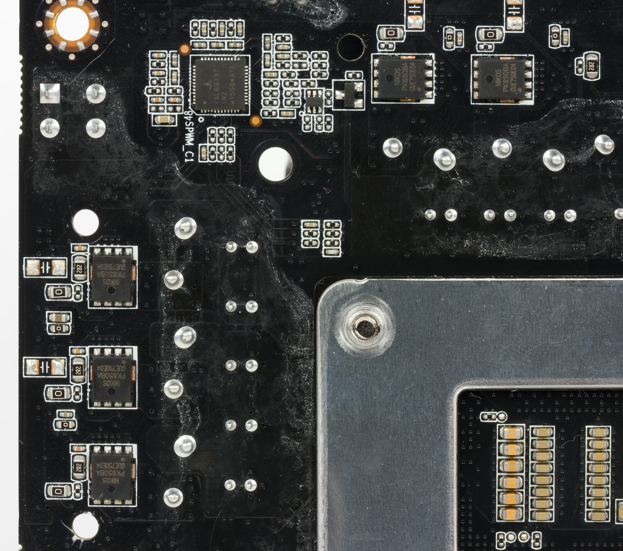 Регулятор напряжения питания процессора 6-фазный и управляется 7-фазным PWM-контроллером Intersil ISL69137. Cами каналы питания построены с использованием MOSFET-транзисторов Nikos PK650BA. PWM-контроллер расположен с обратной стороны платы.