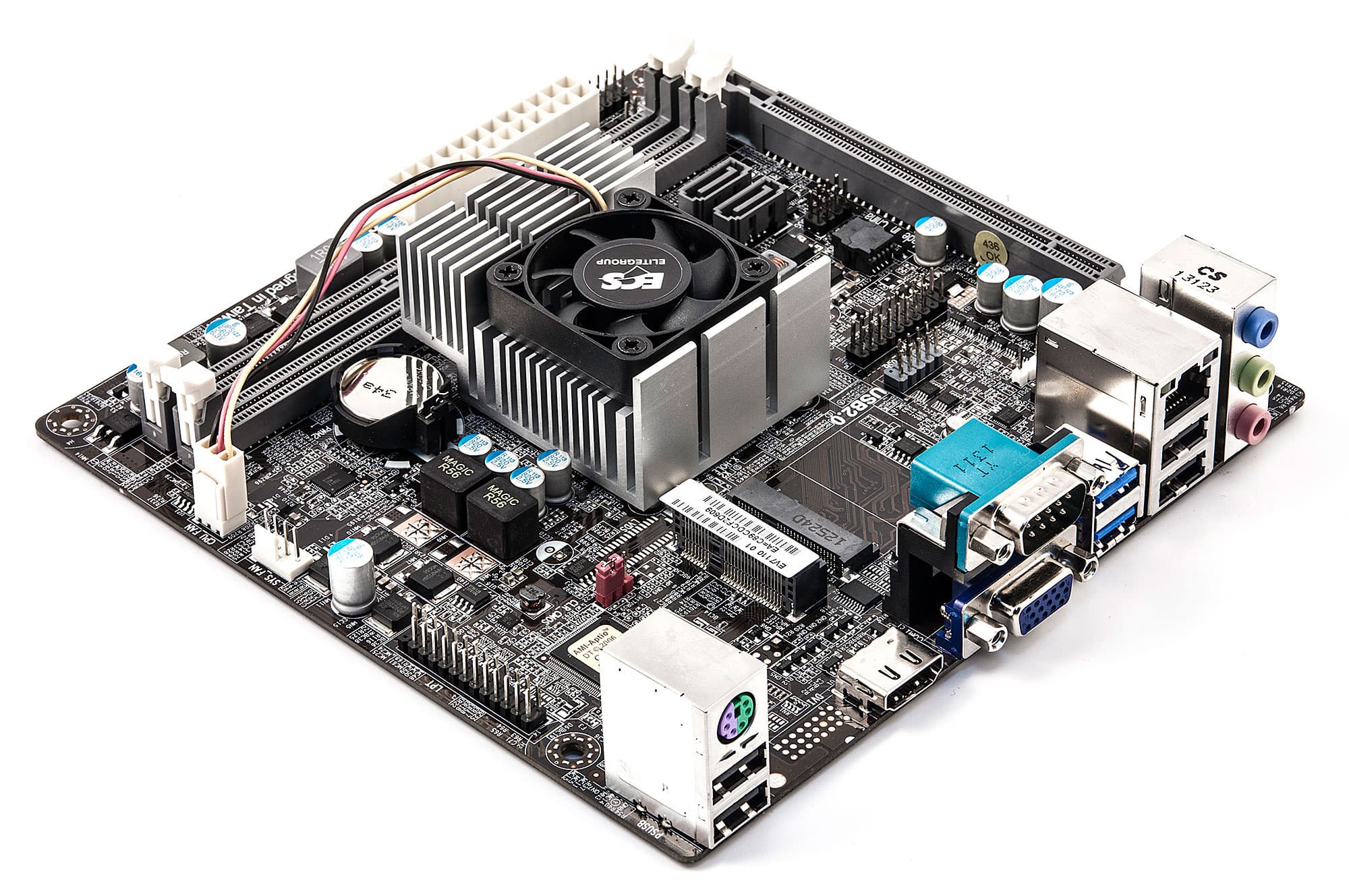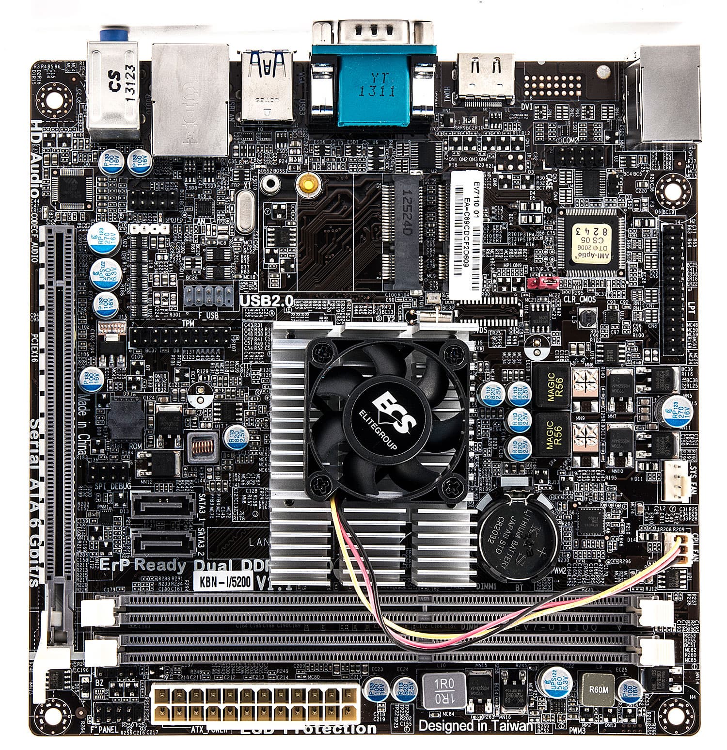 На первый взгляд во внешности ECS KBN-I/5200 нет ничего нового — как мы уже написали выше, за прошедшие два года платы Mini-ITX с интегрированными процессорами стали привычным элементом ассортимента всех торгующих компьютерными комплектующими магазинов. Если же приглядеться чуть внимательнее, в глаза сразу бросается основное отличие плат нового поколения от всех остальных — лишь один небольшой кулер и больше никаких радиаторов. Все просто: Kabini — это однокристальная система (SoC), так что основой платы является лишь одна микросхема APU, а привычный для большинства платформ южный мост чипсета не нужен. Естественно, такой подход развязывает руки производителям системных плат — на освободившемся месте можно расположить что-нибудь полезное. В частности, ECS удалось поместить на плату и полноразмерные слоты DIMM (а не ноутбучные SO-DIMM) для памяти, и пару слотов Mini-PCIe — полной и половинной длины. Ранее нам все это в совокупности не встречалось — либо DIMM, но единственный слот расширения, либо есть слоты Mini-PCIe, но память нужна ноутбучная.