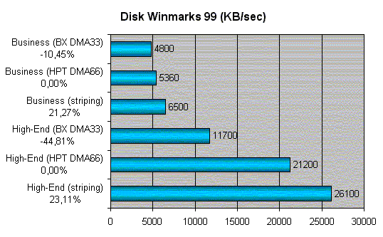 При оценке производительности материнских плат, спроектированных на одном чипсете, ожидать большого разброса показаний по производительности не приходится. Поэтому взаимную производительность разных моделей материнских плат на чипсете BX отложим на потом, а пока посмотрим, насколько хорош внешний UltraDMA/66 RAID контроллер от HighPoint.