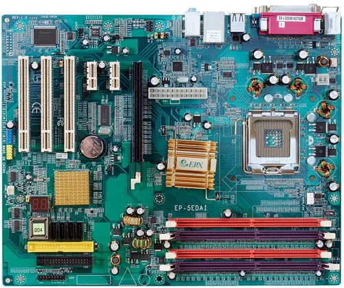 В четырехканальном импульсном стабилизаторе напряжения питания процессора применены 7 конденсаторов по 1800 мкФ (Luxon) и 4 по 560 мкФ (Sanyo). Так же на плате находится стабилизатор напряжения памяти, усиленный применением индуктивных элементов, включающий россыпь конденсаторов емкостью по 1000 мкФ. На плате разведены, но не распаяны датчик открытия корпуса и разъем для подключения Game-порта на планке, причем возможно, что это касается только нашего конкретного экземпляра, так как PCB этой модели уникальна в линейке EPoX. Прочие платы компании, основанные на том же семействе чипсетов, обладают, как правило, большей функциональностью (Gigabit Ethernet + RAID из SATA-дисков + IDE RAID) и ориентированы на память типа DDR (поддержка двух типов памяти — уникальная особенность 5EDAI). Размер платы — 305×245 мм (полноразмерный ATX, крепление к корпусу десятью винтами, все края платы жестко фиксированы).
