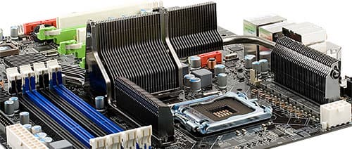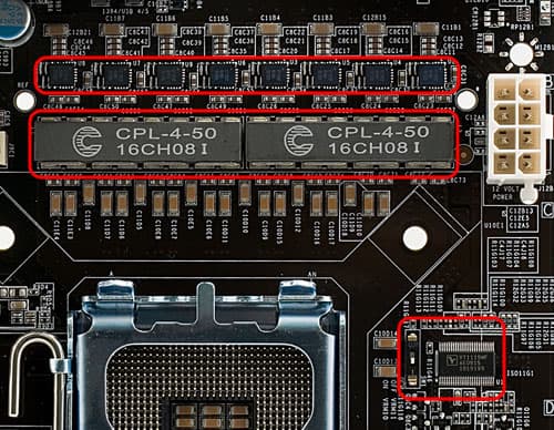 Во-вторых, цифровой ШИМ-контроллер может работать на существенно более высокой частоте, обеспечивая более тонкую регулировку и повышенную стабильность выдаваемого напряжения при значительно меньшем рассеянии тепла. Действительно, пульсация выходного напряжения столь невелика, что вместо привычных емких электролитических конденсаторов (в большинстве сегодняшних топовых моделей применяются экземпляры даже с твердым полимерным электролитом), плата EVGA ограничивается использованием керамических SMD-конденсаторов малой емкости. Заодно отметим и использование обычно применяемых в связке с силовыми модулями Volterra дросселей Coiltronics CPL-4-50 (объединяющих 4 индуктивности в одном низкопрофильном корпусе с ферритовым сердечником). В итоге пространство вокруг процессорного сокета максимально свободно (и это при 8-канальном стабилизаторе!), что позволяет установить практически любые кулеры, добиваясь наибольшего эффекта в охлаждении процессора.