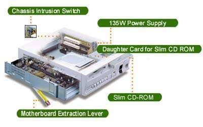 - Разнесение процессора и слотов для плат расширения. Гнездо процессора перемещено с передней части платы на заднюю, рядом с блоком питания. Это позволяет устанавливать в слоты расширения полноразмерные платы — процессор им не мешает. К тому же, решилась проблема с охлаждением — теперь воздух, засасываемый блоком питания, обдувает непосредственно процессор.