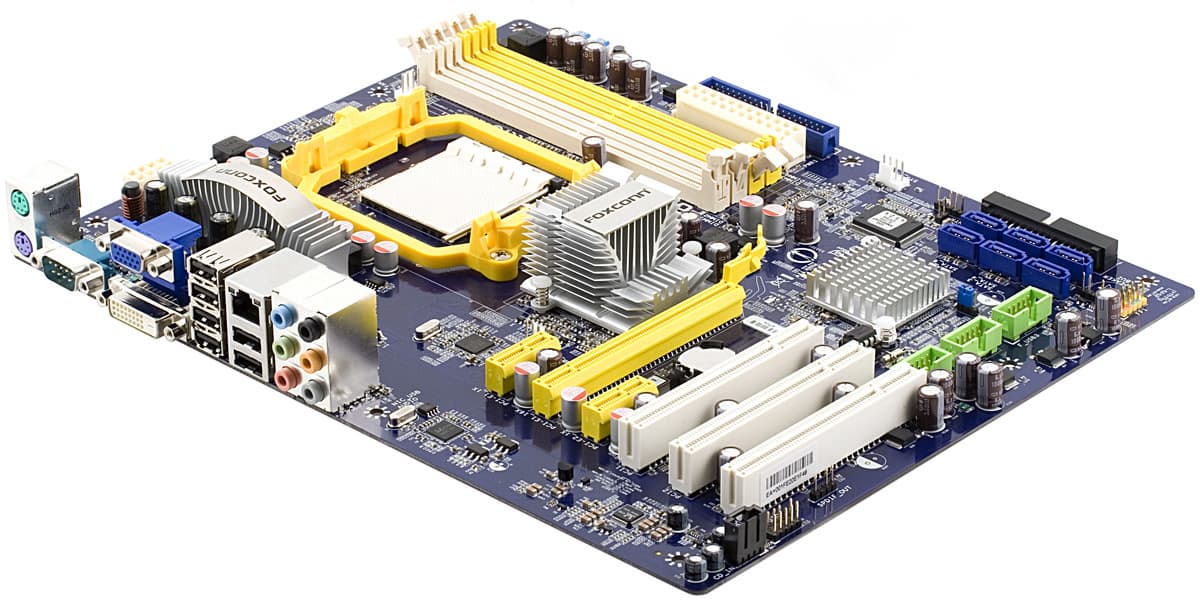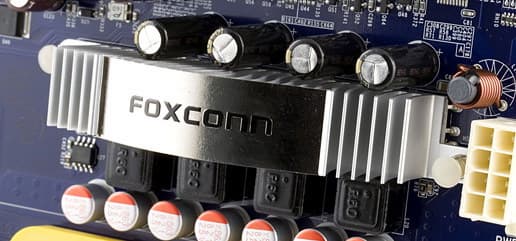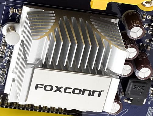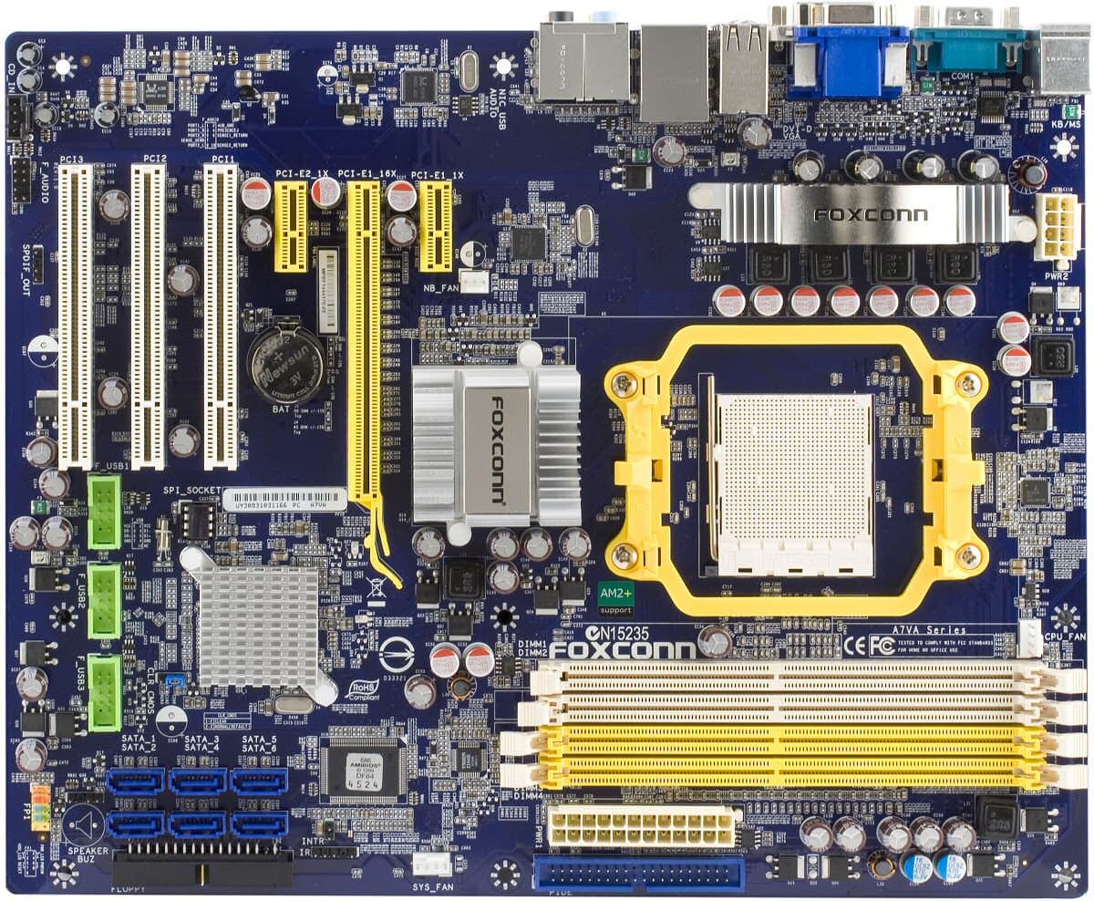 В 5-канальном импульсном стабилизаторе напряжения питания процессора применены по 3 полевых транзистора на канал в 4 каналах, отвечающих за питание процессорных ядер, в пятом канале, ответственном за питание контроллера памяти и HT-шины, установлено 2 транзистора. Установлены 9 твердотельных конденсаторов по 820 мкФ и 4 электролитических по 1000 мкФ (от Mitsubishi). Все предусмотренные дизайном элементы на плате распаяны, в линейке Foxconn имеется еще одна модель на этом чипсете с индексом A7VA-S c усиленной системой охлаждения (радиатор на чипсете связан с радиатором на стабилизаторе напряжения тепловой трубкой). А в самом стабилизаторе установлены исключительно твердотельные конденсаторы (но список поддерживаемых процессоров аналогичный, то есть включает процессоры с TDP не выше 125 Вт). Размер платы — 305?245 мм (стандартный ATX), крепление к корпусу 9 винтами с надежной фиксацией всех углов.