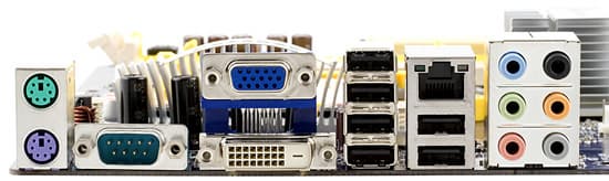 Дизайн классический и во всех отношениях удачный — на плату без труда встанет видеокарта любых габаритов, не затруднив подключение других устройств и оставив доступными 3 слота PCI. Владельцы PCI-устройств должны быть довольны, поскольку на этой плате мы наблюдаем достаточно редкое ныне отсутствие разъемов (для подключения дополнительных планок с портами USB и прочее) за крайним PCI-слотом.