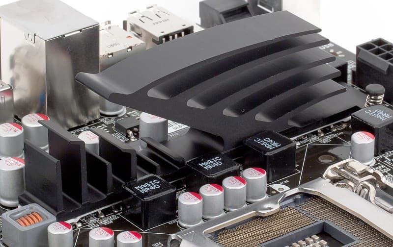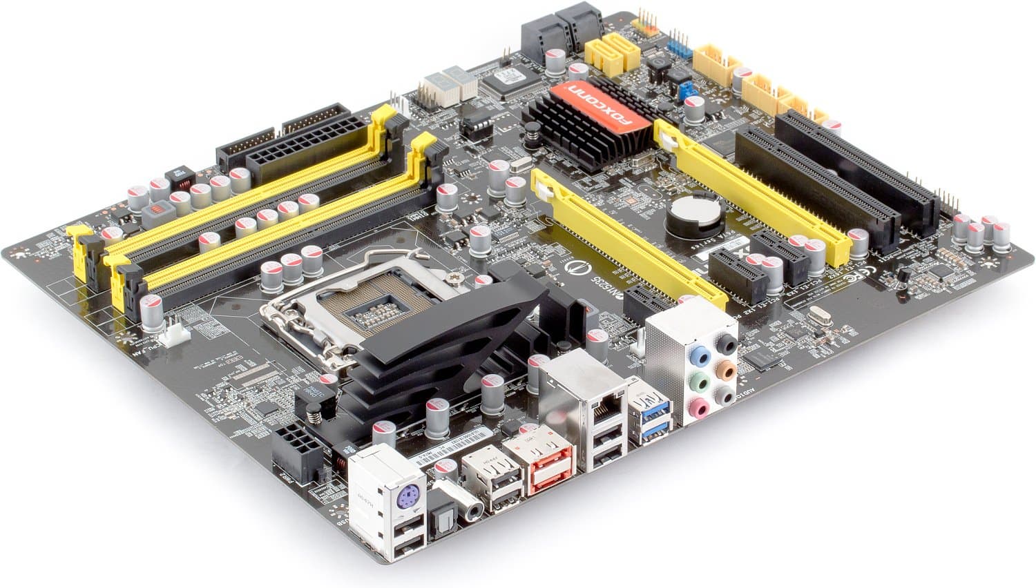 Относительно небольшое количество полевых транзисторов в преобразователе питания процессора не заставило компанию отнестись к их охлаждению с повышенным вниманием. Наоборот, на P67A-S мы видим откровенно декоративную инсталляцию из профилированного алюминия, которую к системе охлаждения можно отнести только вследствие места ее монтажа. Впрочем, нам пока еще не доводилось при тестировании наблюдать проблемы, которые хотя бы отдаленно могли быть вызваны перегревом набортных компонентов — не стала исключением и изучаемая модель Foxconn. На чипсете — вполне традиционный для плат на Intel 5x/6x маленький радиатор, заметно нагревающийся при работе (все-таки TDP порядка 5 Вт), но абсолютно не мешающий установке габаритных карт расширения, прокладке кабелей и пр.
