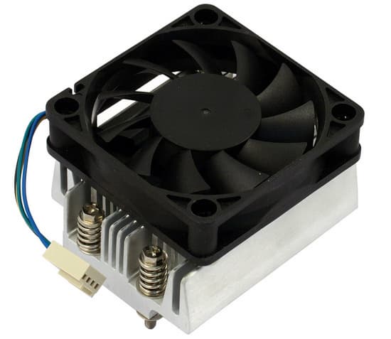 А может и вовсе не остаться, поэтому с платой прилагается два процессорных кулера. Полностью пассивный (на фото выше) может использоваться либо для процессоров с совсем низким тепловыделением, например, одноядерными мобильными Sempron и Athlon, либо когда в конструктиве имеется общий вентилятор. А в случае с более мощными процессорами, особенно когда есть вероятность, что им придется работать длительное время под нагрузкой, лучше поставить кулер с активным вентилятором.