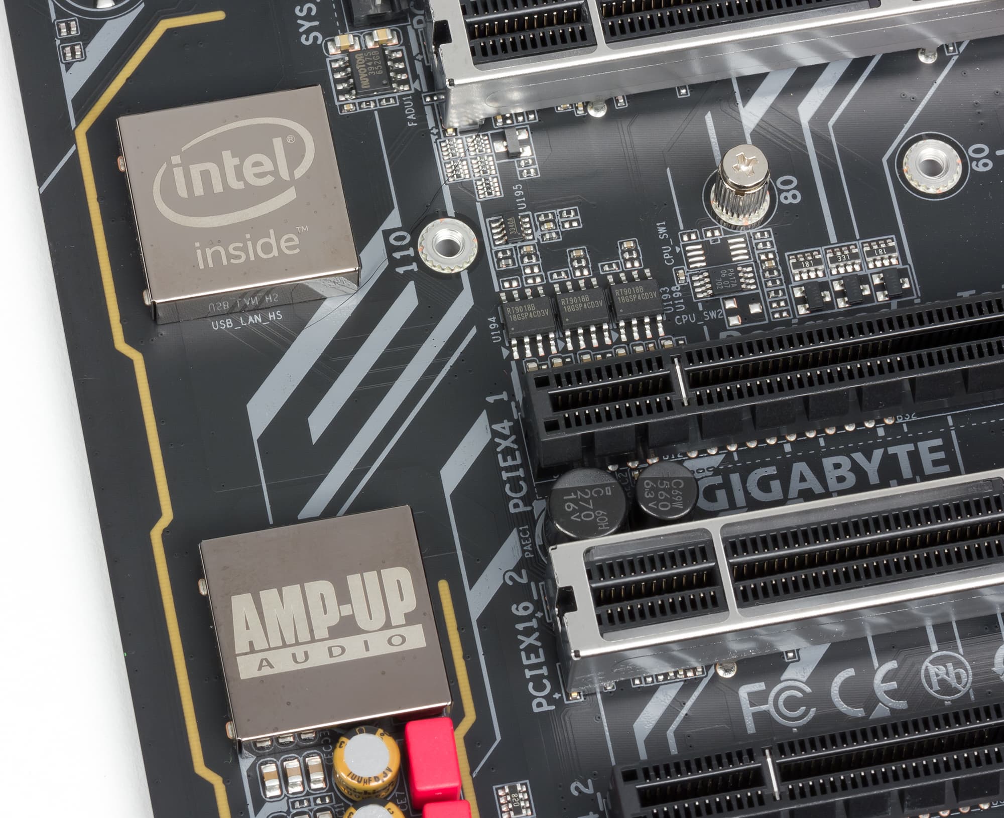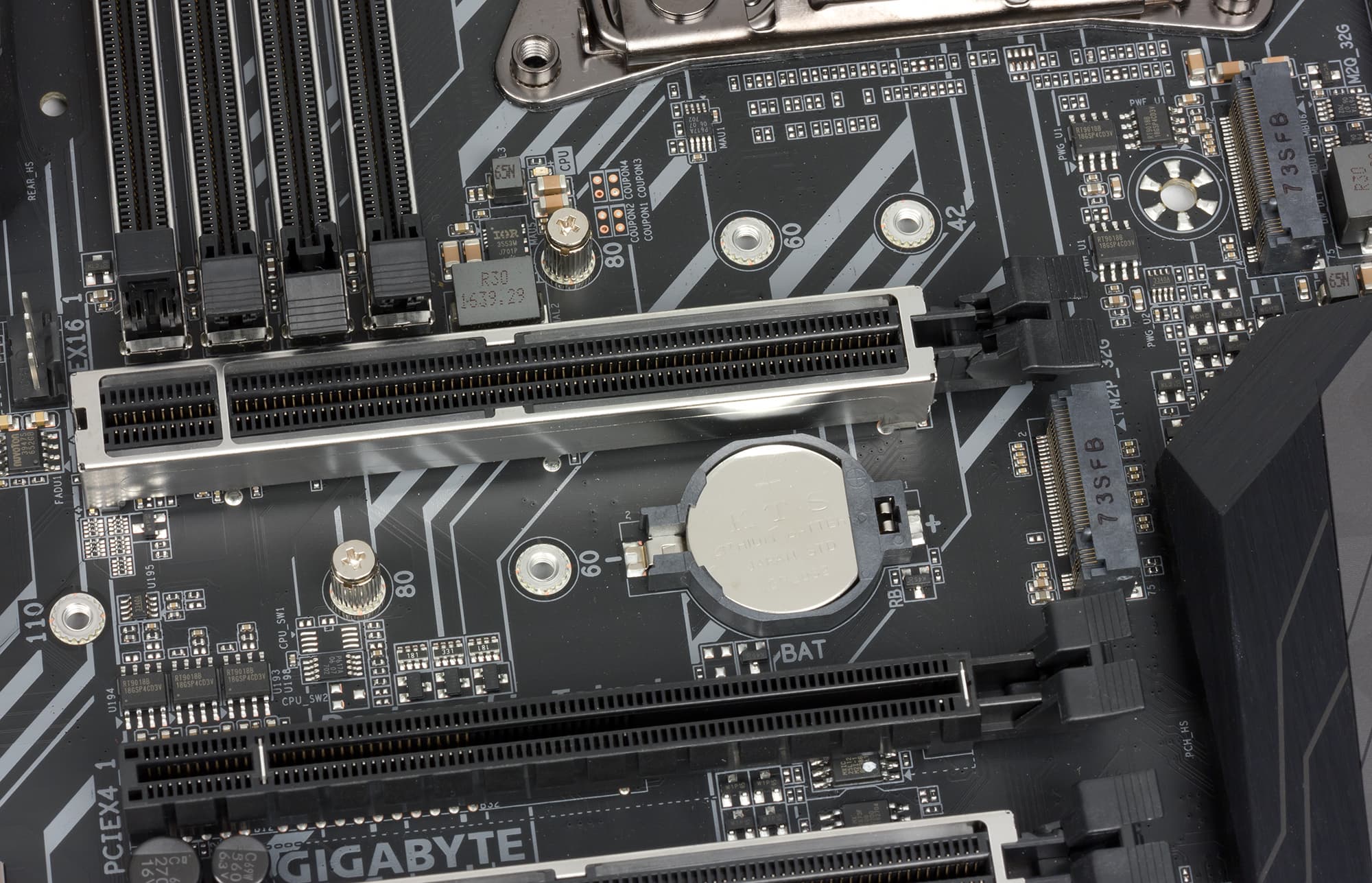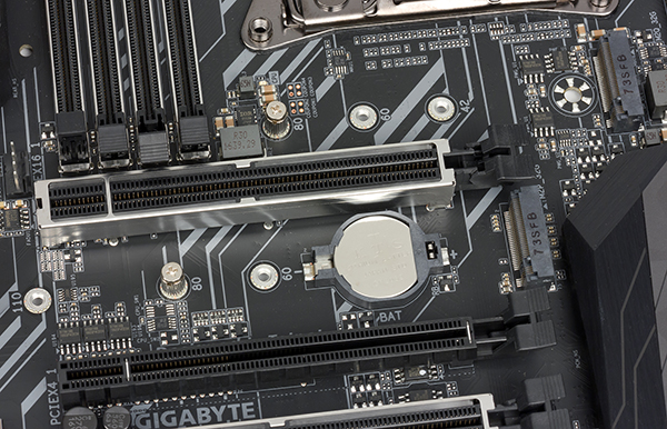 Вообще, в сравнении с платами X299 Aorus Gaming 9 и X299 Aorus Gaming 7, у которых точно такое же количество слотов с форм-фактором PCI Express x16, на плате X299 Aorus Gaming 7 все реализовано максимально просто. Нет никаких переключателей линий PCIe 3.0. В результате получается не очень оптимально, но зато очень дешево.