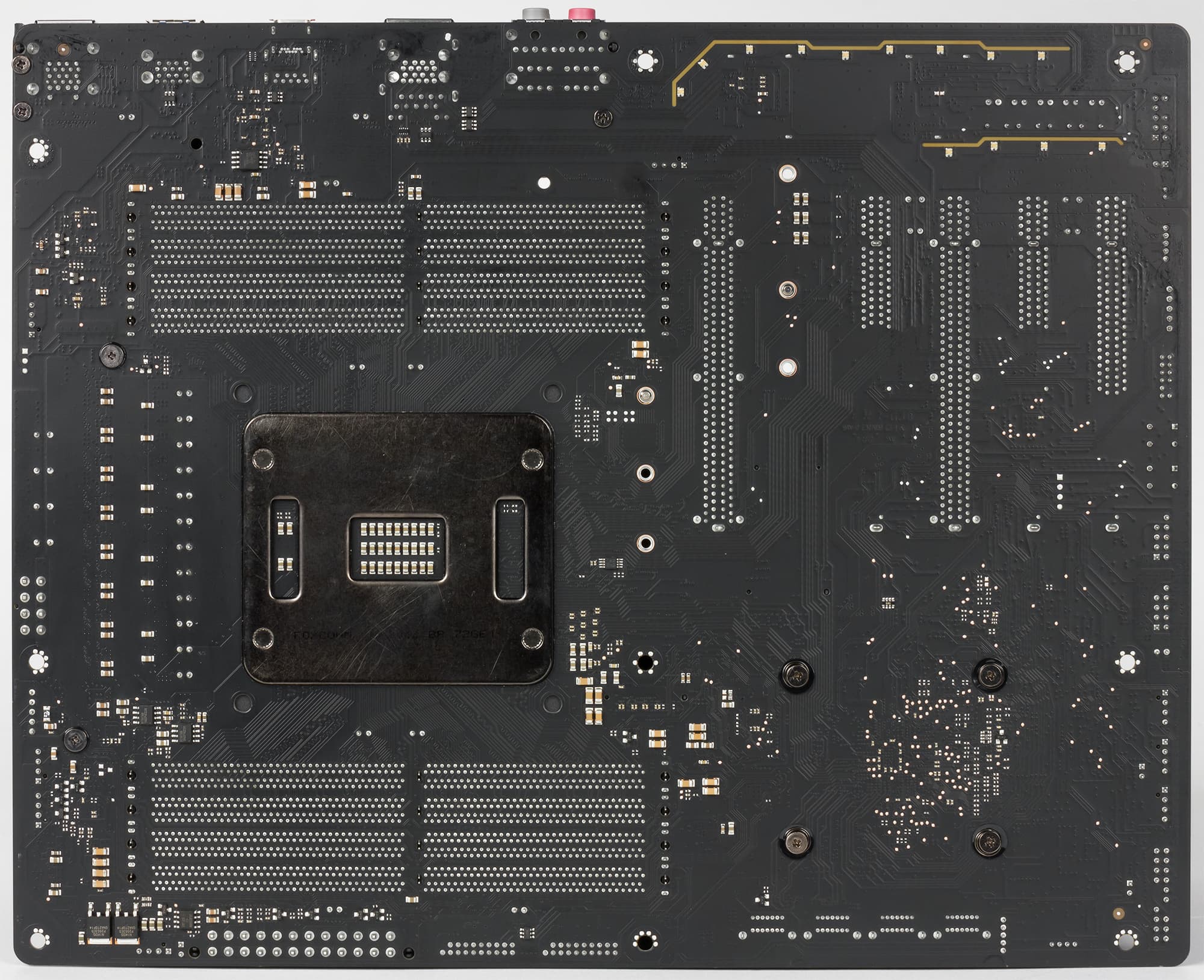 Следующая особенность платы — это реализация RGB-подсветки. Подсветка тут, конечно, довольно скромная (особенно в сравнении с платами X299 Aorus Gaming 9 и X299 Aorus Gaming 7): подсвечиваются лишь два слота PCI Express x16 и радиатор чипсета. Также с обратной стороны платы есть подсветка по контуру зоны аудиотракта.