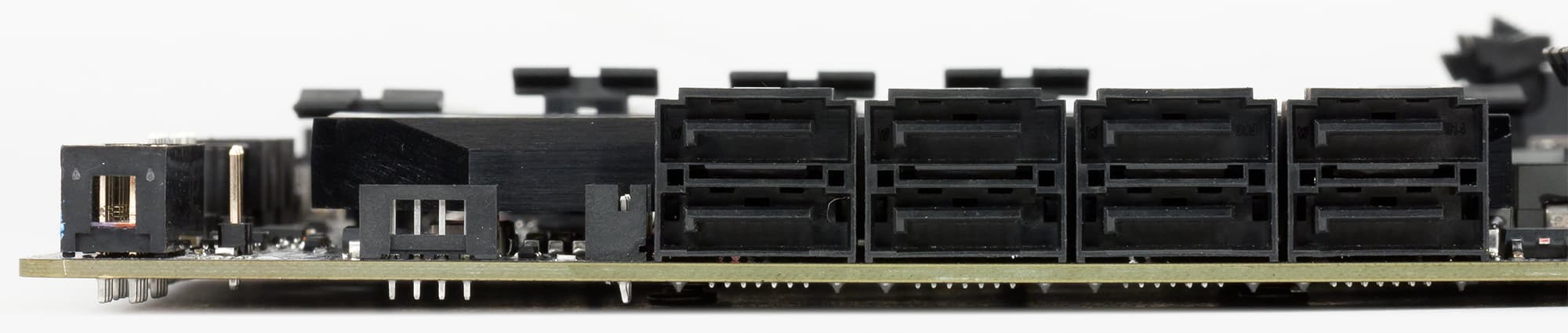 Четыре порта SATA (SATA #4 - SATA #7) разделяются с одним из разъемов M.2 (M2Q_32G). То есть для реализации одного разъема M.2 и портов SATA #4 - SATA #7 используется четыре конфигурируемых HSIO-порта чипсета, которые могут быть портами SATA или портами PCIe 3.0. В результате, если разъем M.2 используется в режиме PCIe 3.0 x4 или SATA, то порты SATA #4 - SATA #7 будут недоступны.