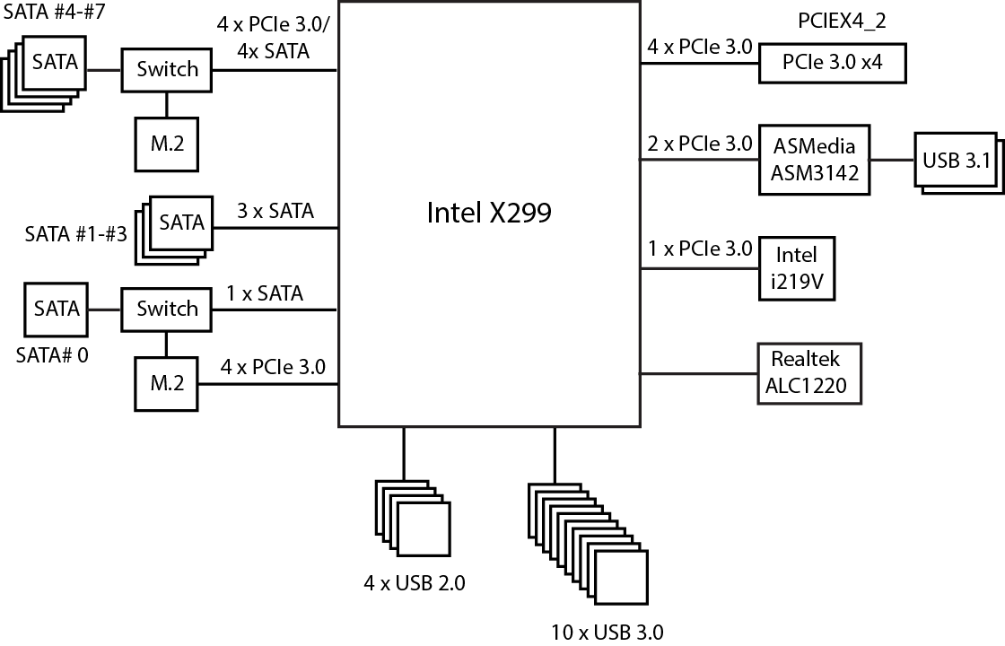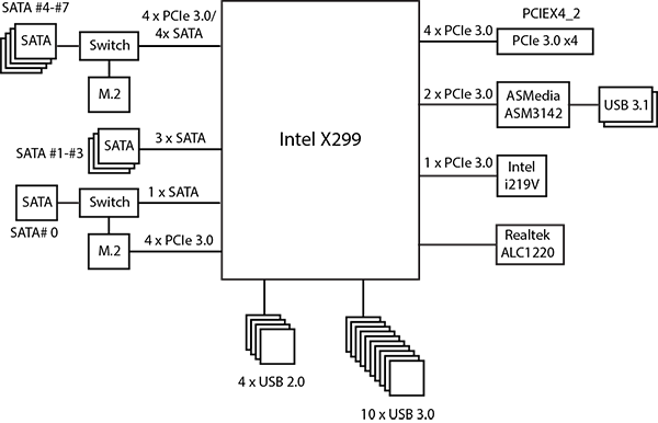 Напомним, что чипсет Intel X299 имеет 30 высокоскоростных портов ввода/вывода (HSIO), в качестве которых могут быть порты PCIe 3.0, USB 3.0 и SATA 6 Гбит/с. Часть портов строго фиксировано, но есть HSIO-порты, которые могут конфигурироваться, как USB 3.0 или PCIe 3.0, SATA или PCIe 3.0. Причем всего может быть не более 10 портов USB 3.0, не более 8 портов SATA и не более 24 портов PCIe 3.0.