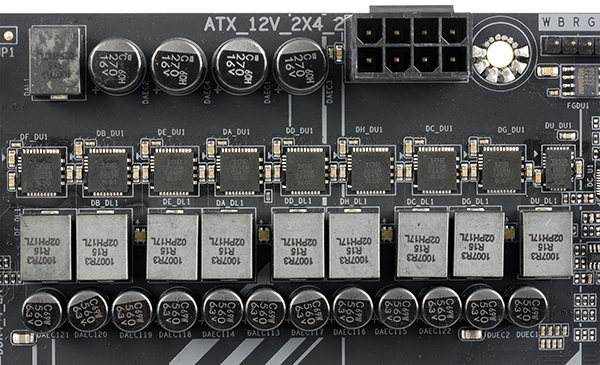 Система питания у платы X299 Aorus Gaming 3 такая же, как и у платы X299 Aorus Gaming 7. Регулятор напряжения питания процессора составной. Восемь фаз питания отводится для ядер процессора (Vcore), этими фазами питания управляет 8-фазный PWM-контроллер IR35201, а сами каналы питания основаны на базе чипов IR3556. За напряжение VccSA и VccIO отвечает PWM-контроллер IR35204 (по одной фазе на VccSA и VccIO), а сами каналы питания основаны на MOSFET-чипах IR3553.