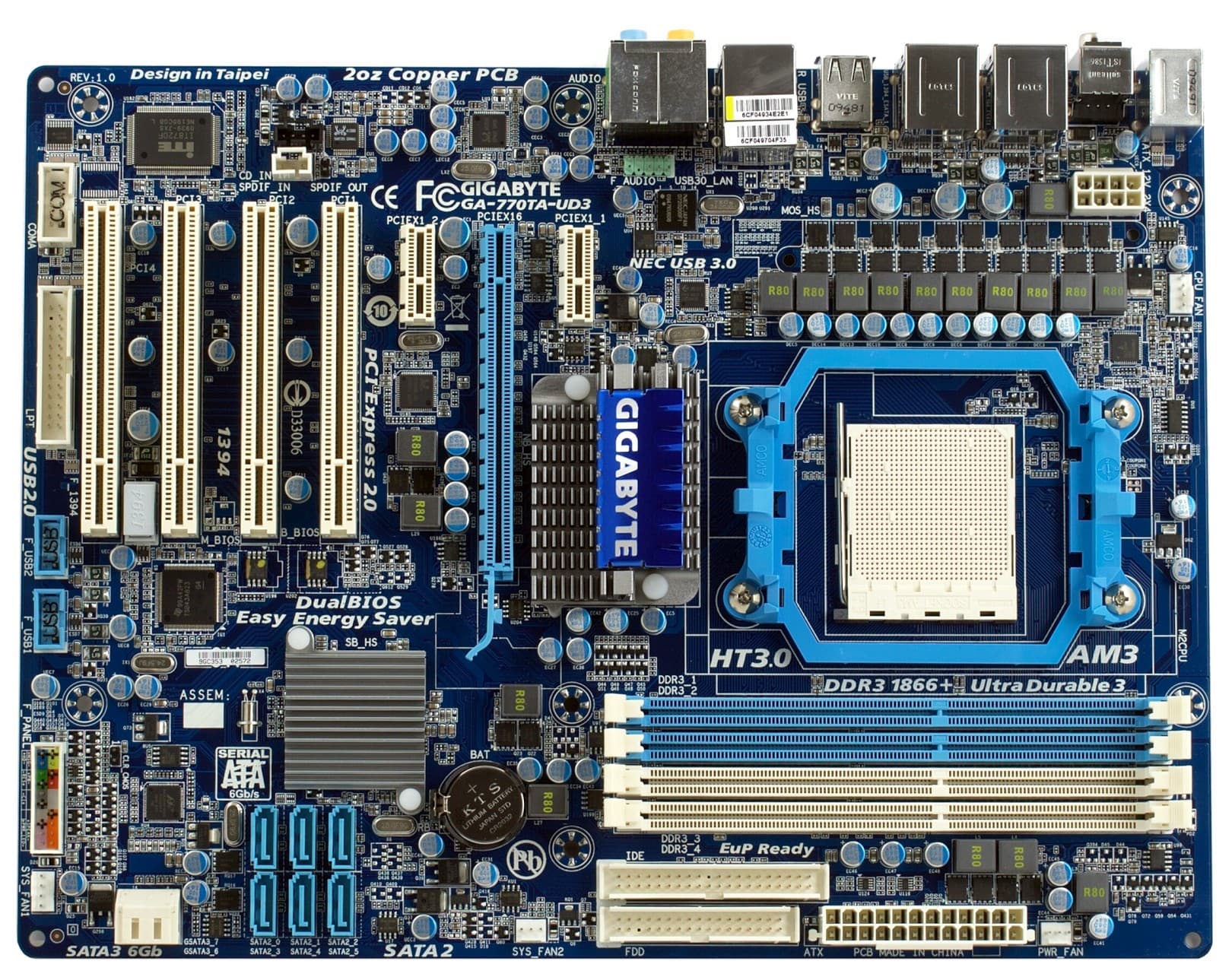 Плата основана на чипсете AMD 770 (северный мост AMD 770 и южный 710), о возможностях которого вы можете узнать из обзорной статьи по ссылке. Для подключения накопителей установлено 6 внутренних портов SATA 2.0 (диски, подключенные к ним, могут объединяться в режимах RAID 0, 1 и 0+1) и два SATA 3.0, реализованных за счет дополнительного контроллера. Также имеется чипсетный канал IDE с поддержкой 2 накопителей PATA/133.