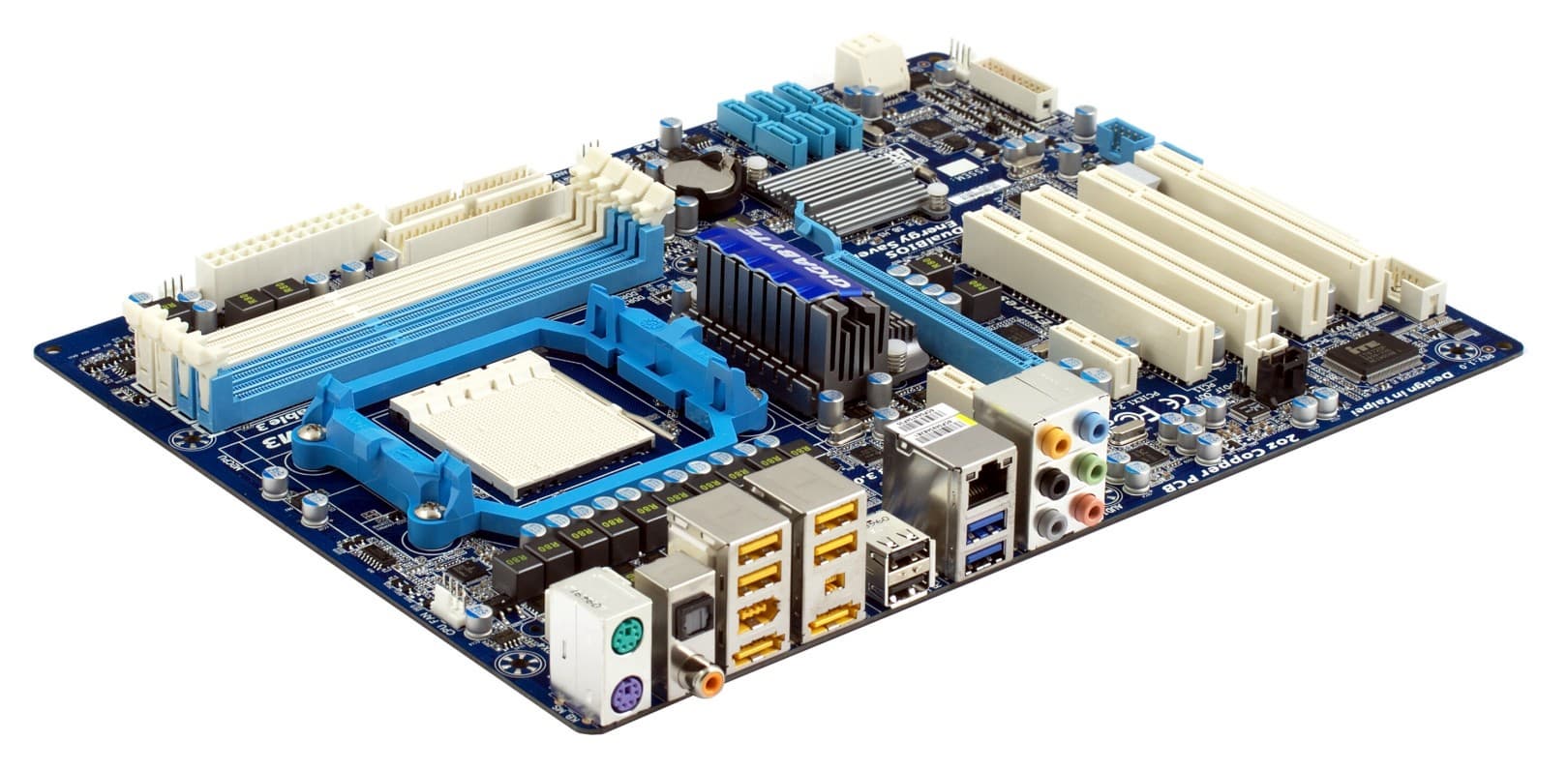 Впрочем, платы с поддержкой современных процессоров (а в данном случае, включая и шестиядерники), но при этом оснащенные с оглядкой назад, можно найти в продаже и от других производителей. Поэтому в Gigabyte решили отличиться еще и тем, что наряду со старыми интерфейсами предусмотрели полный комплект современных. В частности, имеется отдельный контроллер на два порта SATA 3.0.