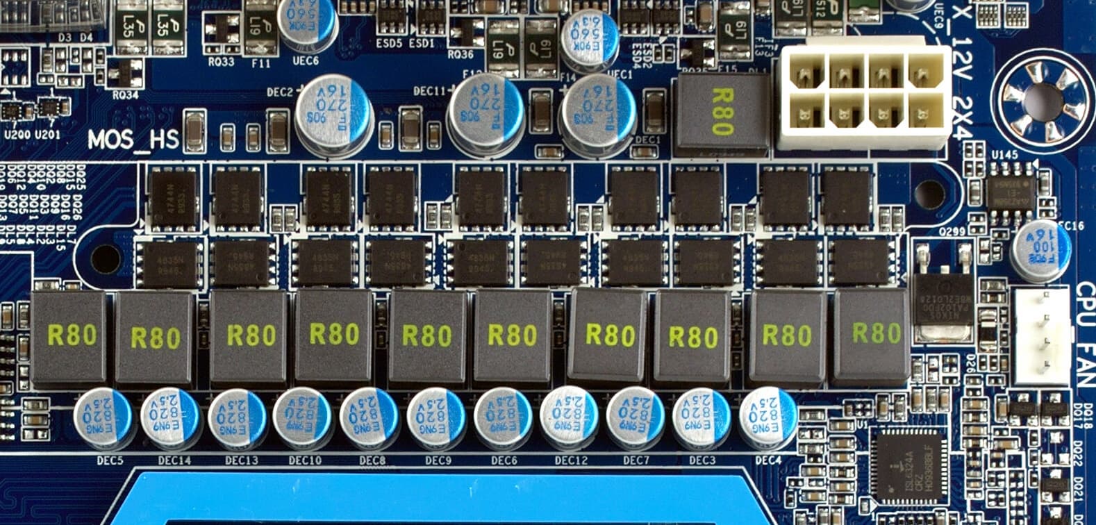 Между тем, стабилизатор напряжения питания процессора по меркам среднебюджетной платы просто роскошный — 10-канальный, установлено по 2 высокоэффективных полевых транзистора с Low RDS (on) на канал, в качестве дросселей установлены катушки с ферритовыми сердечниками. Установлены 11 конденсаторов по 820 мкФ и 3 — по 270 мкФ, все без исключения конденсаторы на плате от ведущих японских производителей, твердотельные. Плата имеет утолщенные вдвое медные слои питания и заземления. Поддерживаются процессоры с заявленным TDP до 140 Вт.
